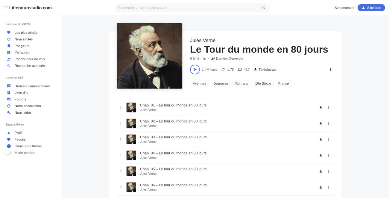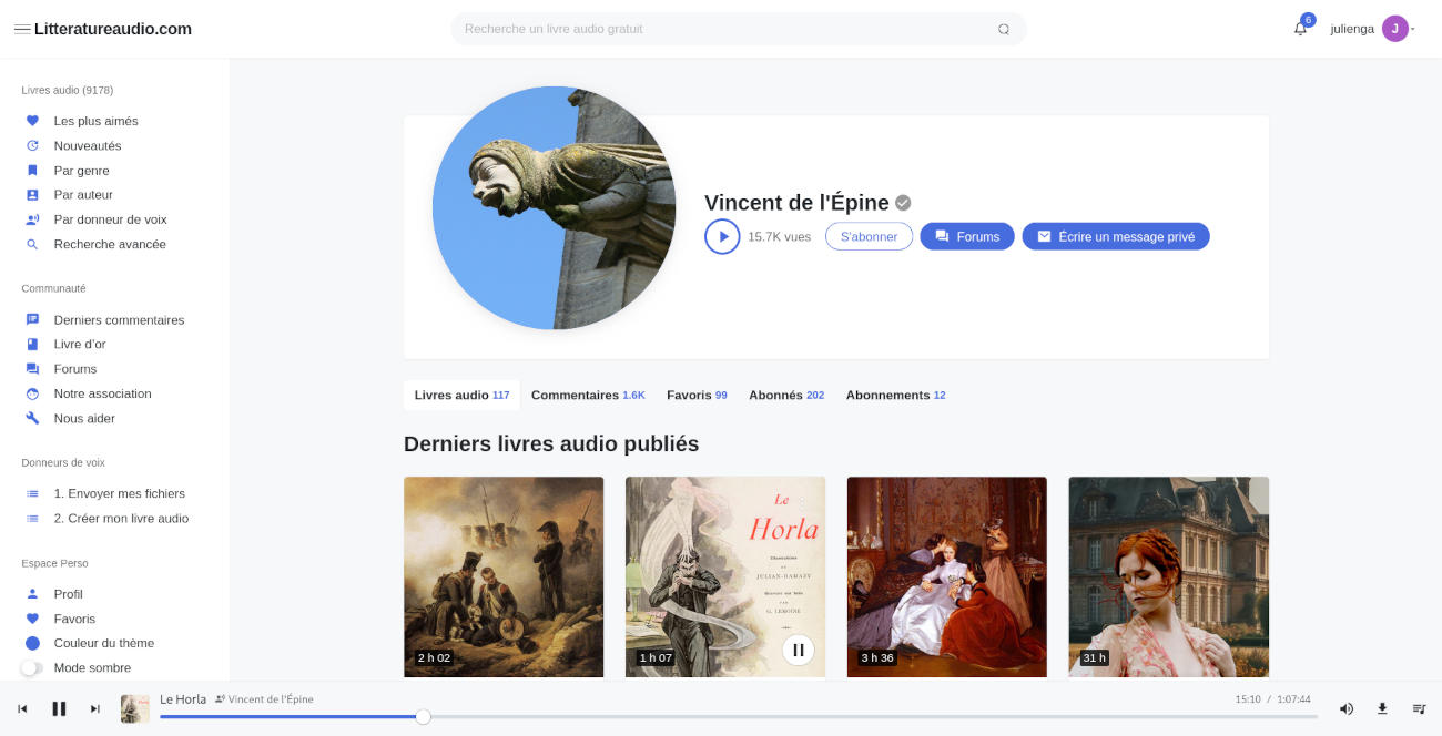 La collaboration avec Litterature-audio.com et son créateur a été l’un des projets les plus ambitieux auquel j’ai eu à m’atteler. Le site existe depuis 2007 et a pour objectif de fédérer des bénévoles qui enregistrent des livres audio libres de droits qui sont ensuite partagés sur le site et mis à disposition des auditeurs et auditrices venus découvrir la litterature francophone.