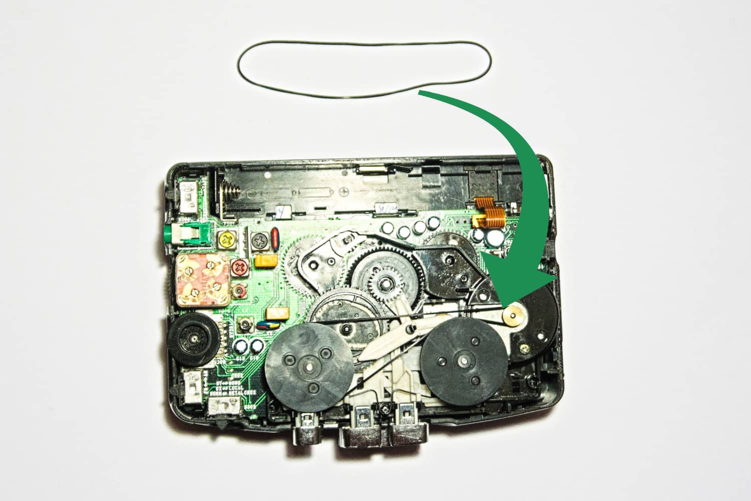 Après quelques essais je me rends vite compte que je ne pourrai pas remplacer la courroie par n’importe quel élastique comparable que j’aurais sous la main.